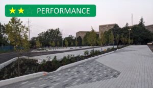 – Transformer le stationnement P1 en une infrastructure plus durable en optimisant l’espace, en gérant écologiquement les eaux pluviales (pavés drainants, îlots de biorétention, bassin de rétention) et en augmentant la canopée des arbres.