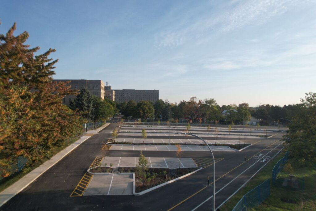 Aménagements verts et gestion de l’eau : Le stationnement bénéficiera à terme d’une couverture canopée de 40 % grâce à la plantation de nouveaux arbres à grand déploiement. Des îlots de biorétention végétalisés et un bassin de rétention gèrent efficacement les eaux pluviales, et les cases de stationnement sont recouvertes de pavés en béton drainant.