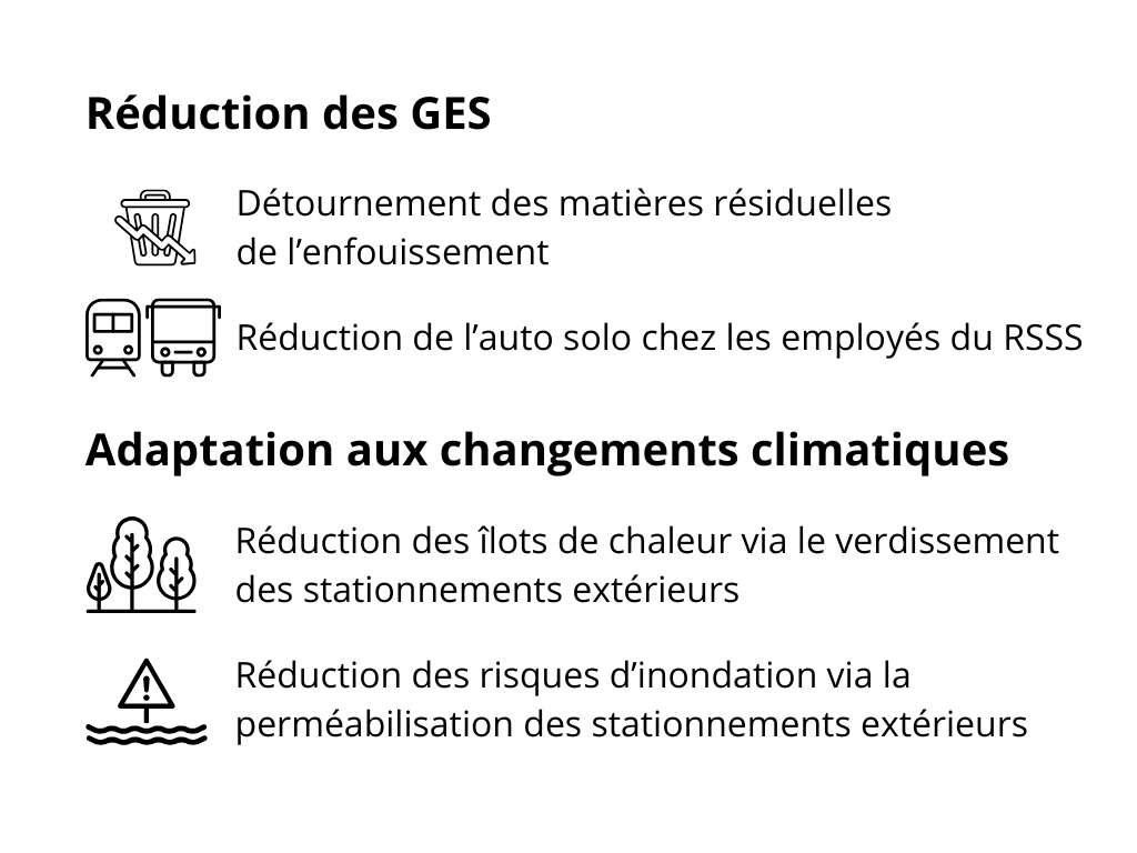 Réduction des GES ; Détournement des matières résiduelles de l’enfouissement ; Réduction de l’auto solo des employés du RSSS.