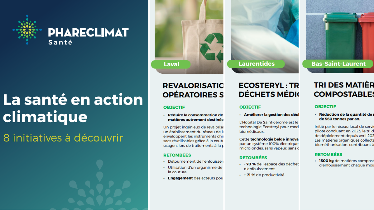 Face aux défis croissants posés par les changements climatiques et leurs impacts sur la santé, le secteur médical est appelé à innover et à adopter des pratiques plus durables. Pour soutenir cette transformation essentielle, PhareClimat Santé est fier de dévoiler son nouveau livret blanc comprenant 8 initiatives inspirantes !